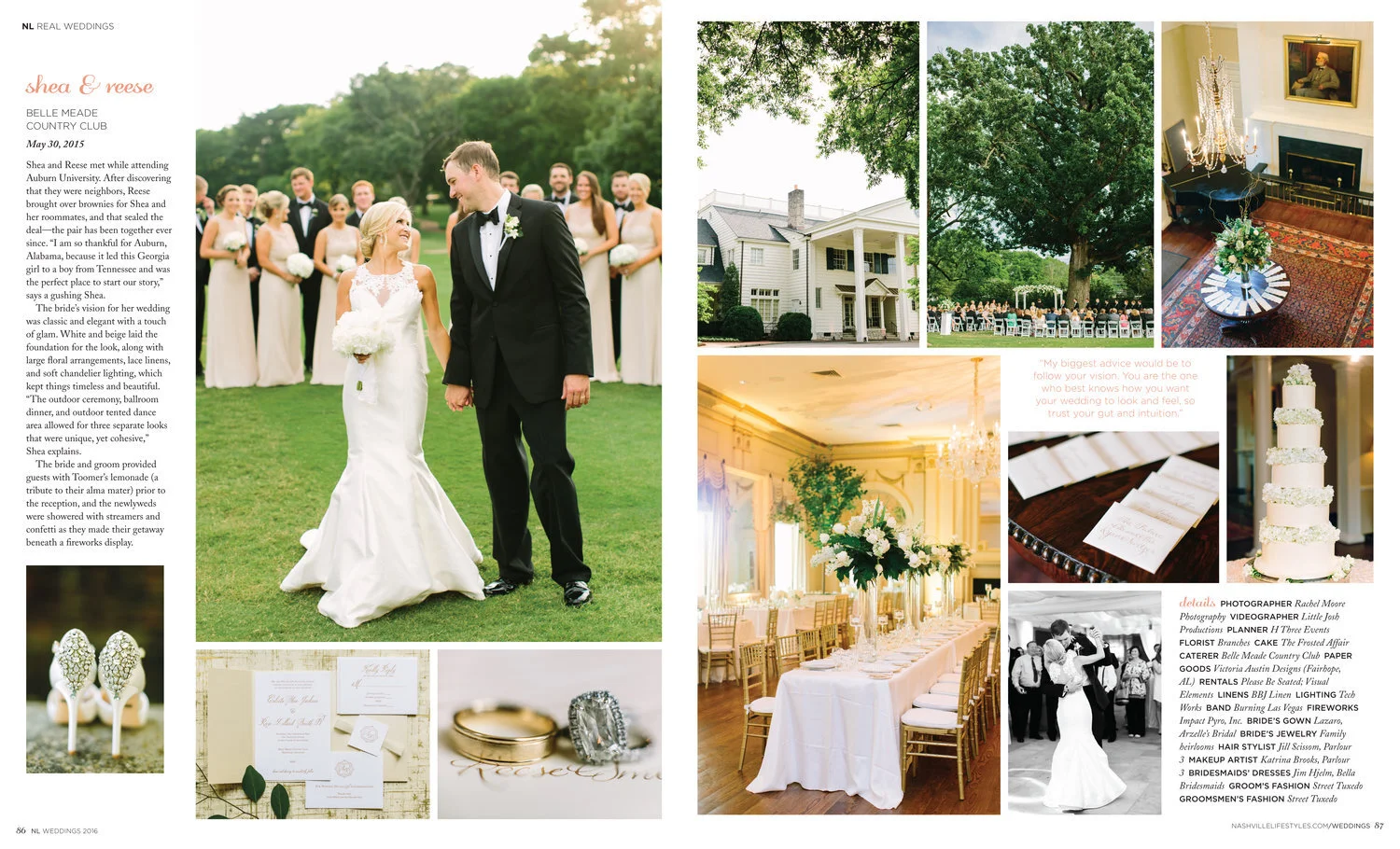 The start of my design career was with a wedding publication in Chapel Hill, where I worked on shoots and the layout of Southern Weddings magazine. Then, while at Nashville Lifestyles, I had a special letter up front as the creative director for NL Weddings, hand selecting the 25 real weddings, and designed the magazine. That led me to Brides magazine, where I worked on advertorial content, promos and events. I have also worked a handful of real weddings with wedding planners and designed and planned much of my own wedding, invitation suite and programs.